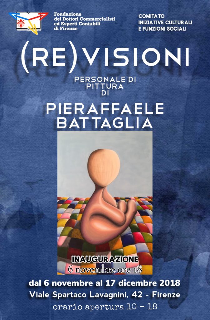 mostra di pittura (RE)VISIONI di Pieraffaele Battaglia organizzata dal Comitato Cultura della Fondazione dell'Ordine dei Dottori Commercialisti ed Esperti Contabili di Firenze. Il Comitato si è posto, fra gli obiettivi, anche quello di far emergere alcune attitudini personali dei Colleghi credendo come non sia predominante il “ruolo del commercialista”, ma la Persona con tutta la sua varietà di talenti, caratteristiche, peculiarità e inclinazioni. La personale di Pieraffaele Battaglia è stata curata dallo storico dell'arte Daniele Franchi mentre Elisabetta Morici ha realizzato per il catalogo editing dei testi e schede delle opere.