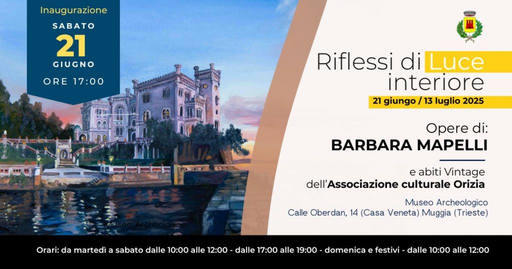 Sabato 21 giugno, alle ore 17:00, presso il Museo Archeologico di Muggia (Calle Oberdan 14 - Casa Veneta), si terrà l'inaugurazione della mostra personale, ”Riflessi di luce interiore", dell’artista e pittrice Barbara Mapelli. L’evento, promosso dal Comune di Muggia - Assessorato alla Cultura, rappresenta un’opportunità unica per immergersi in un dialogo tra arte visiva e moda, alla scoperta della bellezza nascosta nella luce interiore.