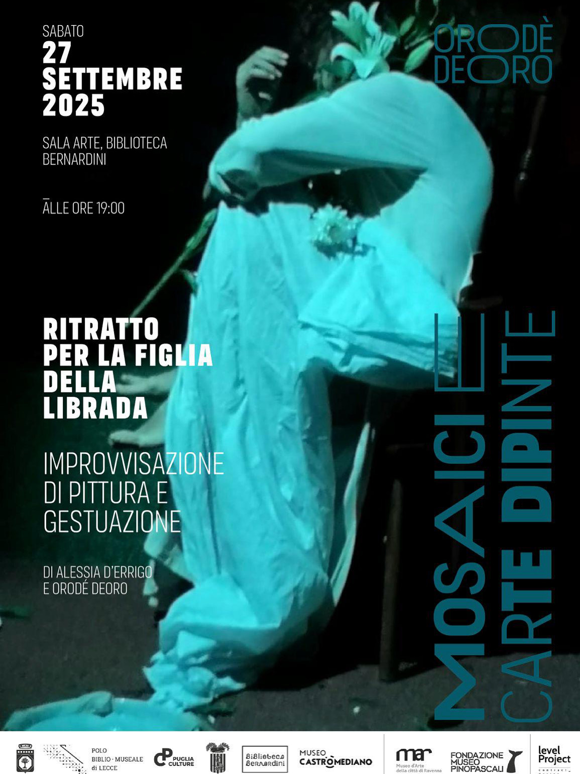 In occasione del finissage della mostra “Mosaici e Carte dipinte” di Orodè Deoro, a cura di Daniele Torcellini, in corso presso il Museo Castromediano e la Biblioteca Bernardini di Lecce, sabato 27 settembre, alle ore 19, la Sala Arte della Biblioteca Bernardini ospita “Ritratto per la figlia della Librada”, una performance che unisce la pittura estemporanea di Orodè alla Gestuazione della poetessa e ricercatrice teatrale Alessia D’Errigo.