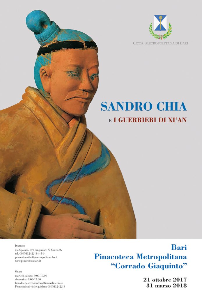 Sta suscitando grandi emozioni la mostra dedicata a Sandro Chia, inauguarata lo scorso 21 ottobre presso la Pinacoteca Metropolitana di Bari. Di particolare impatto visivo si annunciano le dieci grandi sculture, copie 1/1 in terracotta tratte da altrettanti elementi del celebre esercito di guerrieri dell’imperatore Qin Shi Huang ritrovate in Cina, nei pressi di Xi’an, nel lontano 1974, rielaborate dal grande artista toscano con la sua personale, vivacissima cromia, che costituisce una vera e propria “riappropriazione artistica”, capace di conferire nuova vita e nuovi significati a questi pezzi straordinari “archeologici”. L’effetto spiazzante prodotto dai guerrieri di Chia sarà ulteriormente accresciuto dal loro posizionamento nelle sale della collezione permanente della Pinacoteca di Bari, dove dialogheranno con le opere esposte.