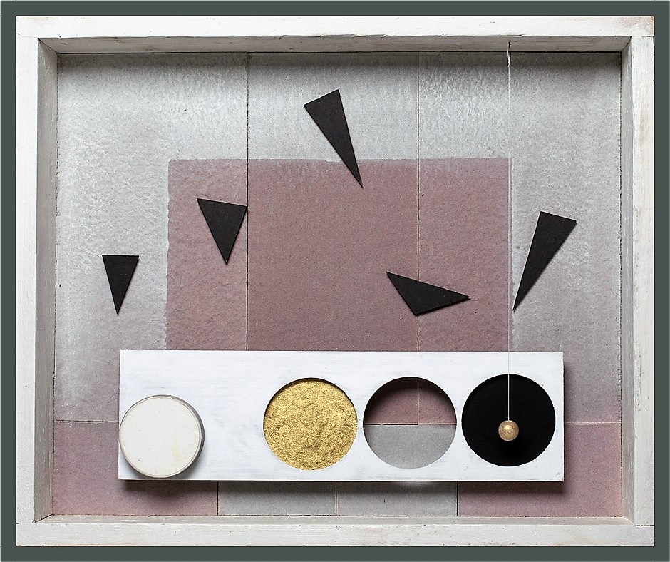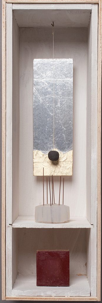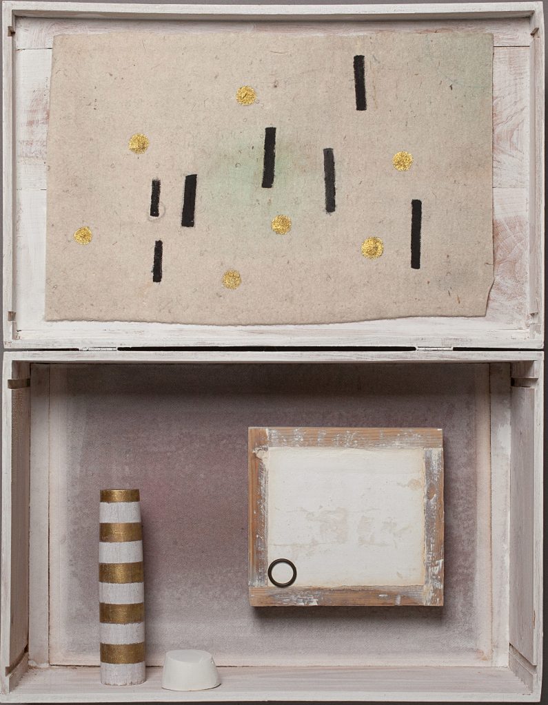 Il legame tra queste due “produzioni” consiste in una continuità lirica di leggerezza e poesia che permea sia i disegni di allora sia le attuali “Stanze”, cassette di legno con oggetti ed elementi di pittura che esprimono sognanti e silenziose architetture scenografiche.