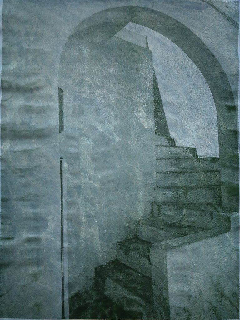 Nelle fotografie di Zhenhua la luce supera la funzione tecnica e si trasforma in materia poetica, capace di generare tempo e spazio, evocare silenzi e restituire una sensazione di immobilità che attraversa architetture e paesaggi. Lo sguardo dell’artista evita il racconto lineare, privilegiando una percezione sospesa in cui la luce diventa memoria e presenza. Walter Yu esplora invece la dimensione concreta della luce. Nel processo serigrafico i raggi ultravioletti si fissano sul telaio, trasformando la luminosità in un’impronta tangibile. Questa trascrizione fisica dialoga con i delicati chiaroscuri delle fotografie. Yu interviene con la propria sensibilità narrativa, amplificando l’aura di mistero degli scatti attraverso strati pittorici e cromatici. La serigrafia diventa così teatro di un doppio movimento, dove i contrasti di luce delle fotografie si riflettono, da un lato il rumore e la fatica manuale del gesto tecnico, dall’altro il silenzio contemplativo dell’immagine compiuta.