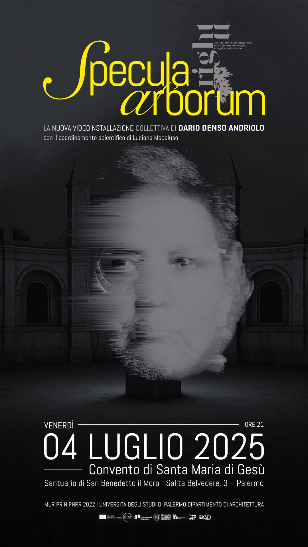 L’iniziativa è promossa nell’ambito delle attività del percorso di ricerca scientifica e artistica del MUR, PRIN PNRR 2022 The Right Tree in the Right Town. Urban Forestry for People in Naples and Palermo, coordinato a livello nazionale dalla prof.ssa Luciana Macaluso del Dipartimento di Architettura dell’Università di Palermo.