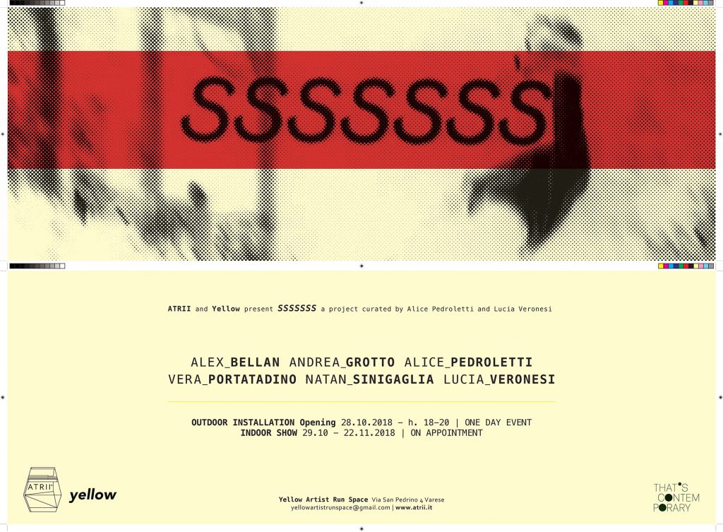SSSSSSS è anche suono, o meglio verso: è la richiesta di silenzio, di attenzione, è un gesto. Il risultato di uno scambio di idee e di un continuo confronto tra gli artisti invitati, che - a differenza di condividere uno spazio nel presente - lo hanno immaginato, ipotizzato e descritto nel futuro, nella distanza e nella durata di poche ore. Mimesi, trompe l'oeil, metamorfosi, architettura dello spazio, prospettiva, illusione, evocazione, inganno, tempo, dimensione e relazione sono le parole chiave attorno alle quali gli artisti hanno ragionato. Parole “ponte” tra il falso serpente corallo e Yellow, spazio indipendente da sempre dedicato alla pittura contemporanea e alle sue declinazioni, che diventa spazio di restituzione esterna ed interna in uno scambio di ruolo tra luogo e funzione.