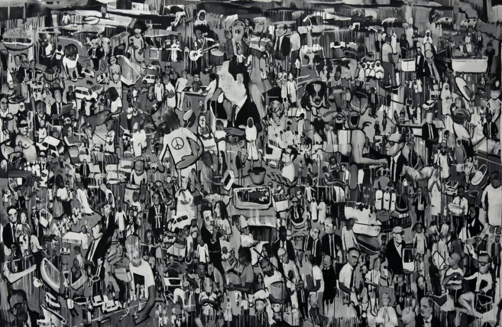 Il lavoro di Ettore Pinelli guarda a quella parte della produzione di Daniele Galliano che osserva la folla, gli aspetti della vita collettiva, le diverse forme di aggregazione. C’è un comune procedere antropologico nei due, quell’osservare le folle per capire cosa si nasconda dietro ai fenomeni.