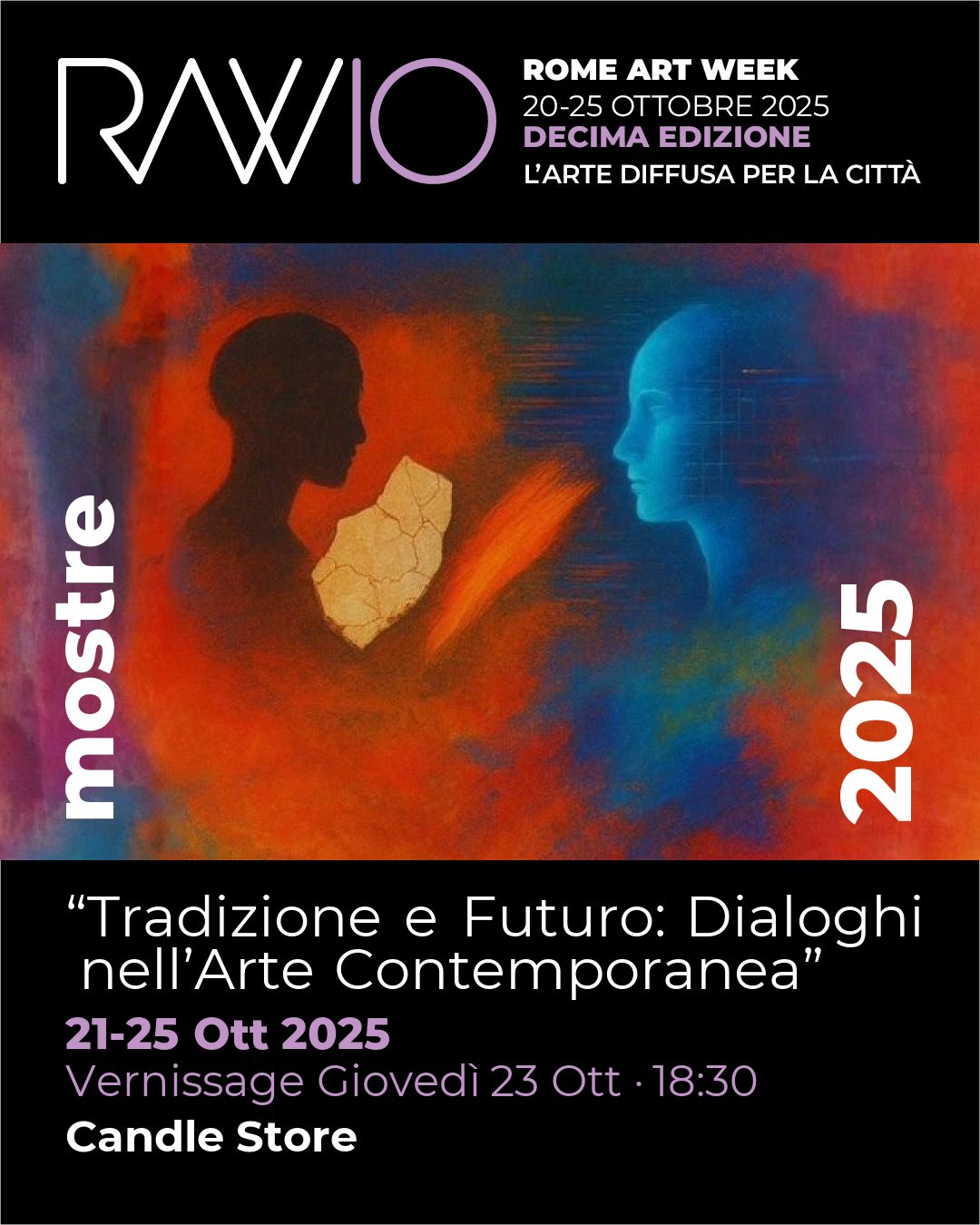 In occasione della Rome Art Week 2025, mostra collettiva tra generazioni e linguaggi: fotografia, pittura, ceramica, installazione, digitale e AI. Un dialogo tra tradizione e futuro, promossa e ospitata al Candle Store, con una selezione art a cura di Antonio Lavorgna.